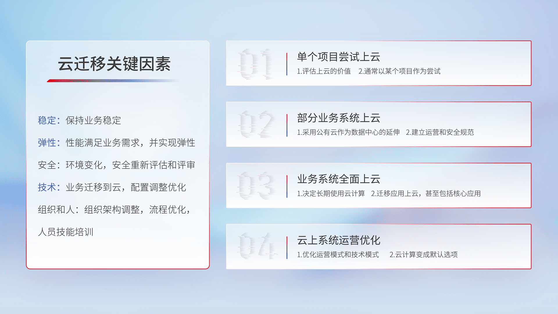 结合实际业务,,,,从规划设计、、、云平台选型、、云原生改造、、、、数据迁移、、集成交付,,迁移全过程为客户识别最佳上云路径,,做好风险识别管理,,设计网络架构、、、身份权限、、安全审计合规、、操作审计、、日志审计、、监控告警策略、、、、多站点容灾设计等,,对云上基础设施进行整体规划,,,,提升IT治理水平,,以满足弹性、、、高可用、、、高性能的需求。。